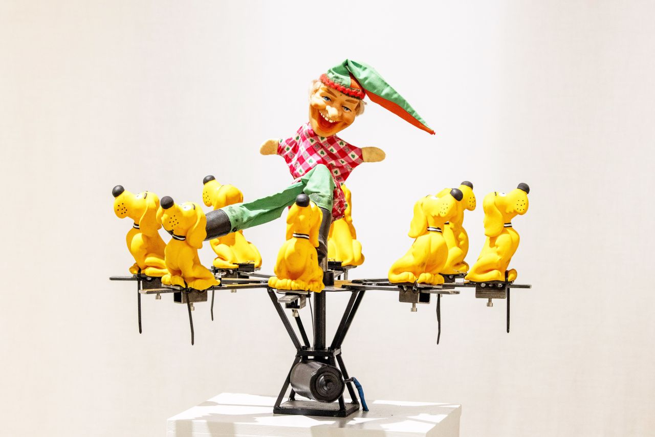 „Starthilfe“ klingt nach Panne und leerer Batterie. Manchmal kann natürlich auch der Lebensmotor stottern und man braucht einen Schubs. Dann kann Starthilfe auch nach Bürokratie und Ämtergängen klingen. Wie auch immer, reibungslos ist weder das eine noch das andere. In Guido Weggenmanns gleichnamiger Installation gibt eine Kasperlefigur einem der gelben Hunde, die ihn in umringen, einen Tritt und das Ganze bewegt sich. Sein Bein sieht ungewöhnlich lang aus als sei er für diesen Job geradezu prädestiniert, die Kasperlefigur zeigt hier einmal mehr ihre dunkle Seite. Wer will, kann hier ein Modell für Lohnarbeit sehen oder die Diktatur eines Tricksters, wenn nicht gar eines Clowns.