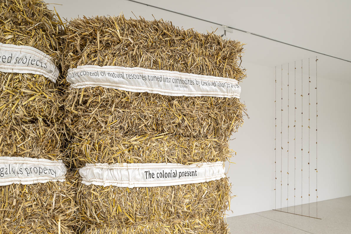 Im großen Schaufenster, das die Räume des Kunstvereins zur Stadt hin öffnet, hat Tagny eine Wand aus Strohballen gestapelt, die von Rüschenbändern zusammengehalten werden, bestickt mit Zitaten und Fragmenten aus Texten von postkolonialen Theoretiker*innen wie Max Haiven, Sylvia Winter und Robin D.G. Kelley. „The colonial present“ steht da unter anderem zu lesen. Tatsächlich ist die koloniale Gegenwart, auf die Tagny anspielt, beim Blick nach draußen zum Greifen nahe: Nebenan etwa, im gerade eröffneten Geomuseum mit seinen Mineral- und Gesteinssammlungen, die bei der Suche westlicher Forscher nach ausbeutbaren Lagerstätten im globalen Süden anfielen; oder direkt gegenüber, beim EDEKA – die Abkürzung stand ursprünglich für Einkaufsgenossenschaft der Kolonialwarenhändler. Eine Viertelstunde Fußweg entfernt, im Botanischen Garten der Uni Münster, die Wilhelm II. erst kürzlich aus ihrem Namen strich, gedeihen von deutschen Kolonialisten nach Westfalen importierte Pflanzen aus Ostafrika in den Gewächshäusern. Der Liste kolonialer Spuren in Münster ist im Stadtmuseum momentan eine eigene Ausstellung gewidmet.