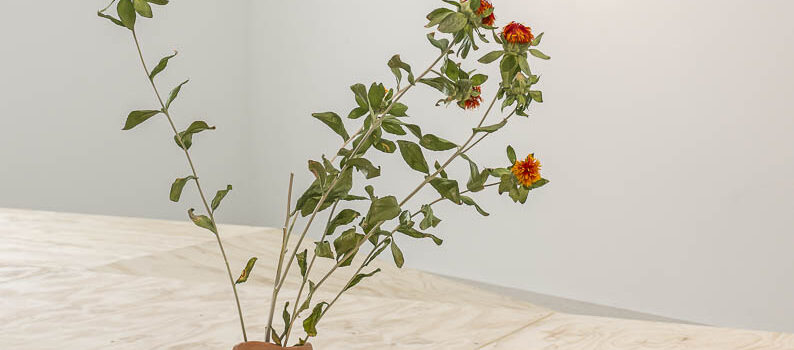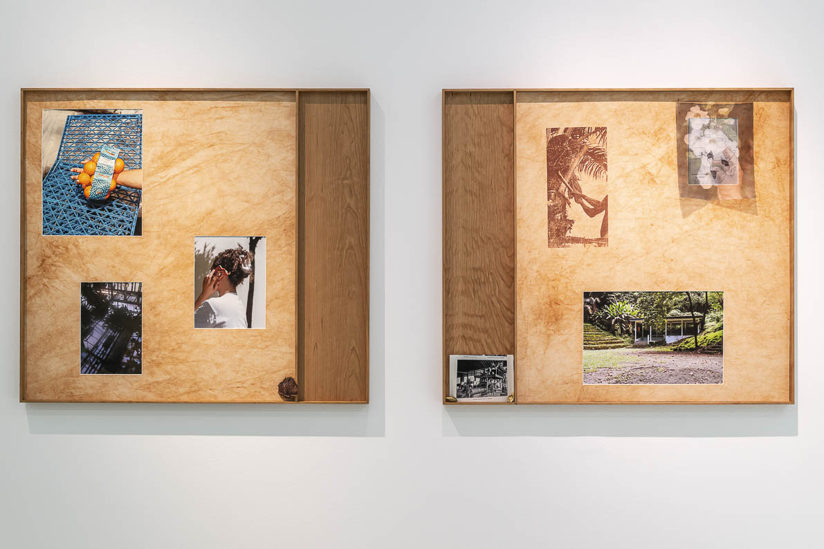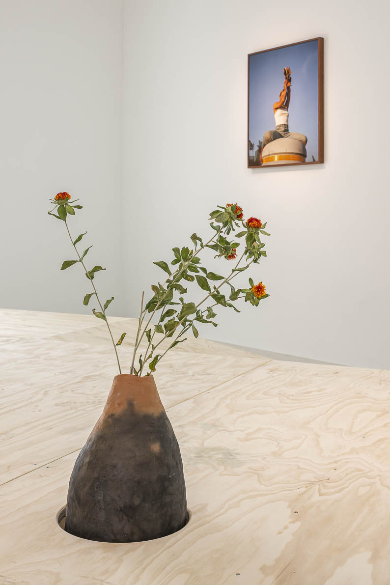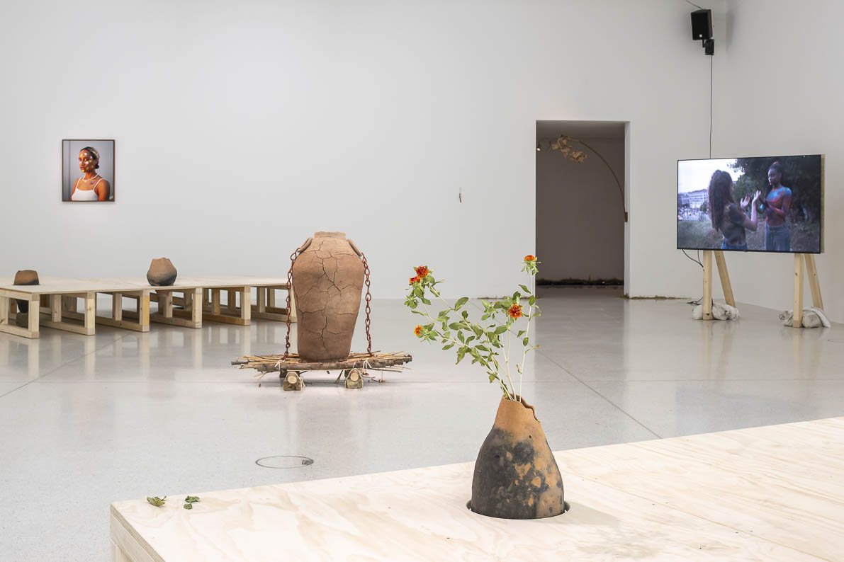 In ihrer zweiteiligen Videoarbeit „Precarious Architecture“ erkunden zwei Schwarze Performerinnen diese Verbindung in mimetischen Choreografien zwischen Palmgewächsen und bröckelnder Gartenarchitektur. Auf rohe Holzgestelle aufgebockt, flankieren die Video-Screens zwei über Rampen begehbare Podeste, in die aus Ton gebrannte Gefäße eingelassen sind, bestückt mit getrockneten Zweigen und Ketten aus Kaurimuscheln. Als Hybride zwischen Landschaftsmodell und Museumsdisplay laden sie die Besuchenden ein, sich physisch mit der Geschichte unter ihren Füßen auseinanderzusetzen – und auch mit der Zukunft dieser Geschichte. Denn Landschaften sind für Tagny wandelbare Orte individueller und kollektiver Erinnerung. Die Spuren von Herrschaftsverhältnissen und den Erschütterungen der Kolonialgeschichte, die in sie eingeschrieben sind, machen sie zugleich zu Orten der Trauer, des Gedenkens und des Nachdenkens über neue, künftige Formen von Verbindung und Koexistenz.