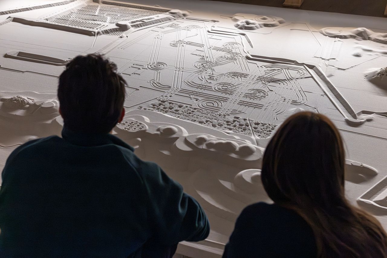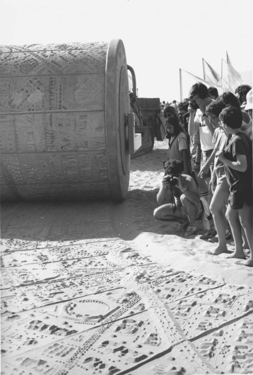 Vielleicht ist es eine frühe Übung in Sachen Demut, Sandburgen vom Wasser abgetragen und verschwinden zu sehen. Es bringt einen womöglich dazu, an die Veränderbarkeit der Welt zu glauben. Strandbesuche gehören zu den Kindheitserinnerungen von Carl Cheng (*1942). Der amerikanische Künstler ist in Kalifornien aufgewachsen, heute lebt er in Santa Monica. Und hier verwirklichte er Mitte der 1980er Jahre das „Santa Monica Art Tool“. Die riesige Walze, die von einem Traktor über den Strand gezogen wurde, funktionierte wie ein Rollsiegel. Sie hinterließ im Sand ein Stadtbild, das aussah wie die stilisierte Topografie von Los Angeles. Im Museum Tinguely, wo derzeit die Einzelschau Chengs „Nature never loses“ gezeigt wird, sieht man in einem Video Jugendliche aufgeregt auf Straßenzüge deuten, die ihnen bekannt vorkamen. Der Strand wurde Chengs Leinwand, eine Leinwand zumal, auf die immer wieder neu gedruckt werden konnte – egal wie oft die Stadt von unzähligen Füßen in den Sand getrampelt wurde. Er variierte das Prinzip durch einen Plotter, mit der man eine Sandfläche behandeln konnte. Was damit möglich wird, zeigt sich in einem der Ausstellungsräume des Museum Tinguely.